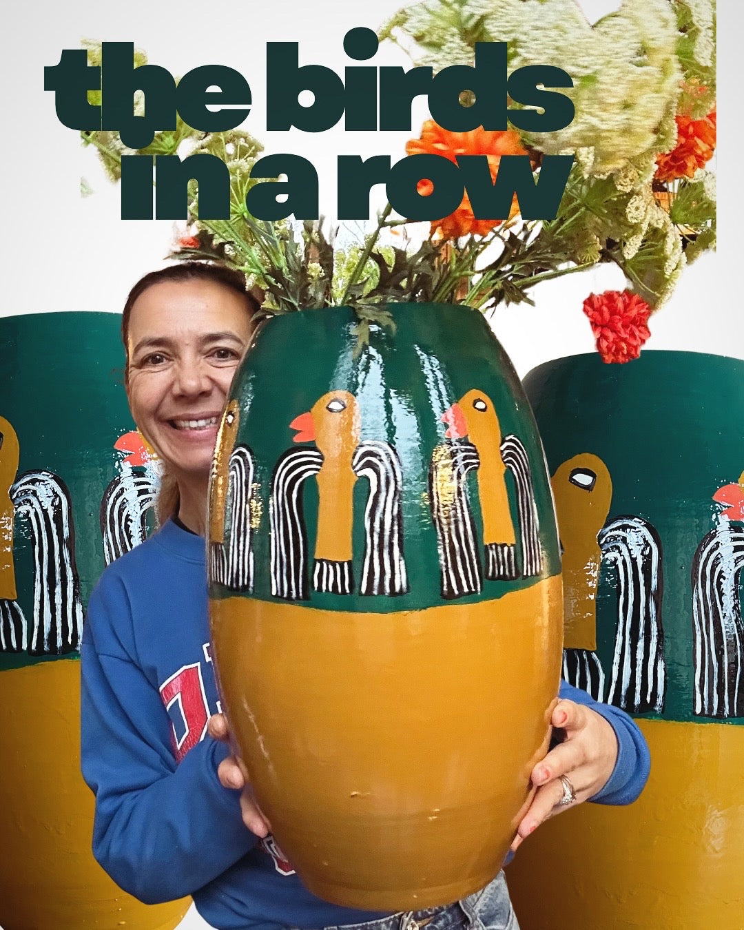 Big stone flower vase handpainted with eclectic birds in a row by Nathalie. The vase was found by my mother in the thrift store she works as a volunteer. Every Hop’s starts with the help of people who find old products that deserve a second life!