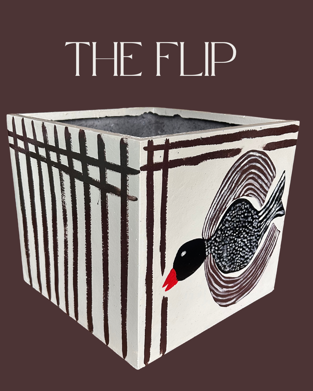 A large square Hop's made of polyester. The old pot was found on the street in Buitenveldert, a part of Amsterdam Zuid and is the perfect large pot because it is not so heavy. 2 sides of this Hop's have a bird paining and 2 sides have graphic stripes. This Hop's has a hole so you can place it in your garden but you can also put a 'boring' pot with a plant in this Hop's and give it a spot in your home.